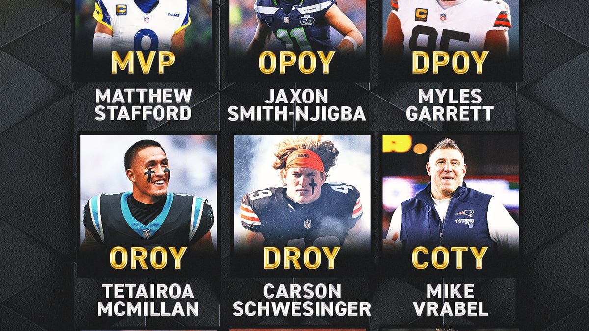Thankfully, a non-quarterback won this award — Seattle WR Jaxon Smith-Njigba. And he was well deserved of the award. But Patriots quarterback Drake Maye was a finalist and got five first-place votes. Rams quarterback Matthew Stafford, the NFL MVP, got three first-place votes. And Bills QB Josh Allen got one.